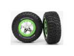 Kompletní zadní kola pro 2WD, přední i zadní pro 4WD RC auta Traxxas. Stříbrný disk se zeleným ráfkem s pneumatikami BFGoodrich KM2 Mud Terrain a vložkou.
