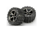 Kompletní univerzální kola pro auta Traxxas Revo 1:16. Disk Gemini v barvě černý chrom s nalepenými pneumatikami Talon a vložkou. Rozměr disku 52×40 mm. Celkový rozměr 80×48 mm. Unašeč je šestihran 12mm s offsetem24 mm.